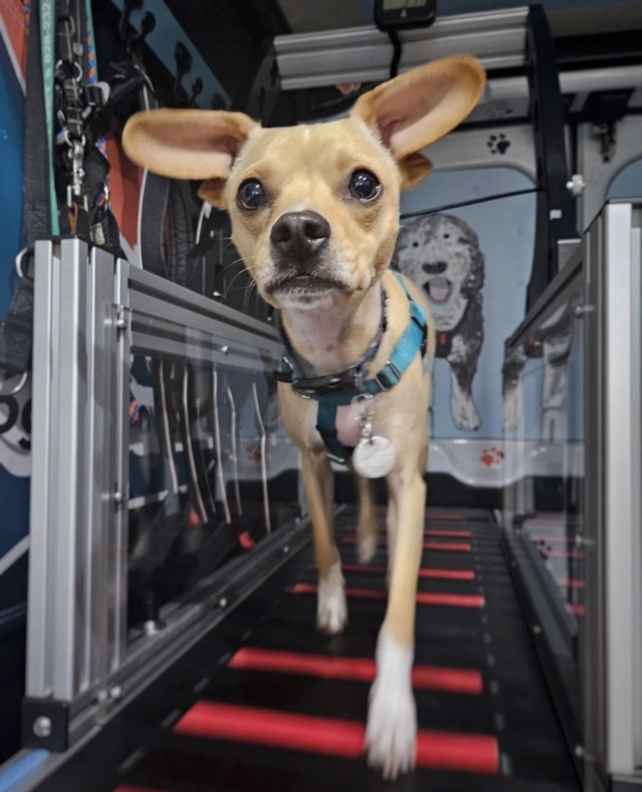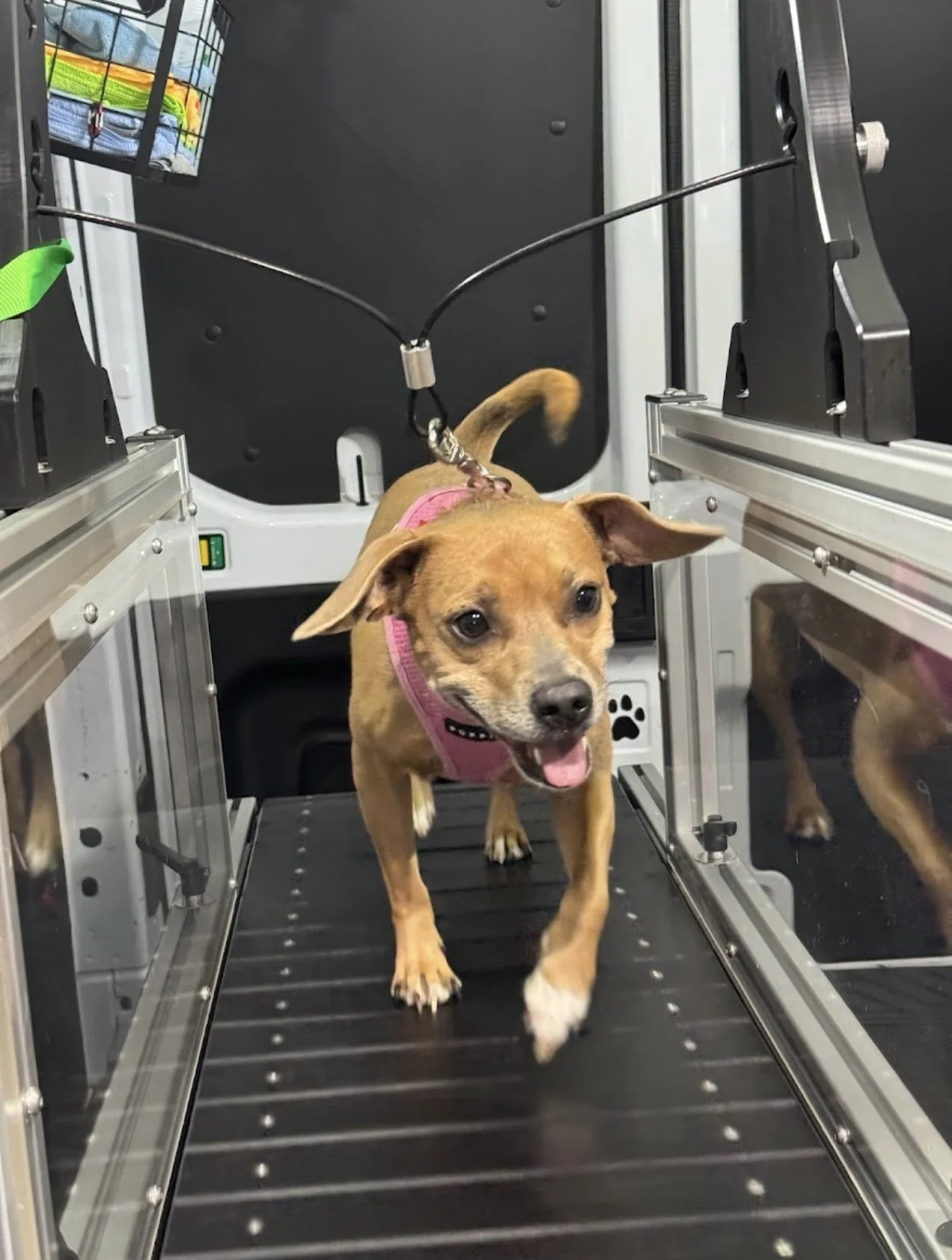 Our temperature controlled transit van is equipped with two slatmills that are powered by your dog’s energy alone, so they can go as fast or as slow as they like. It’s not only safe, but fun!